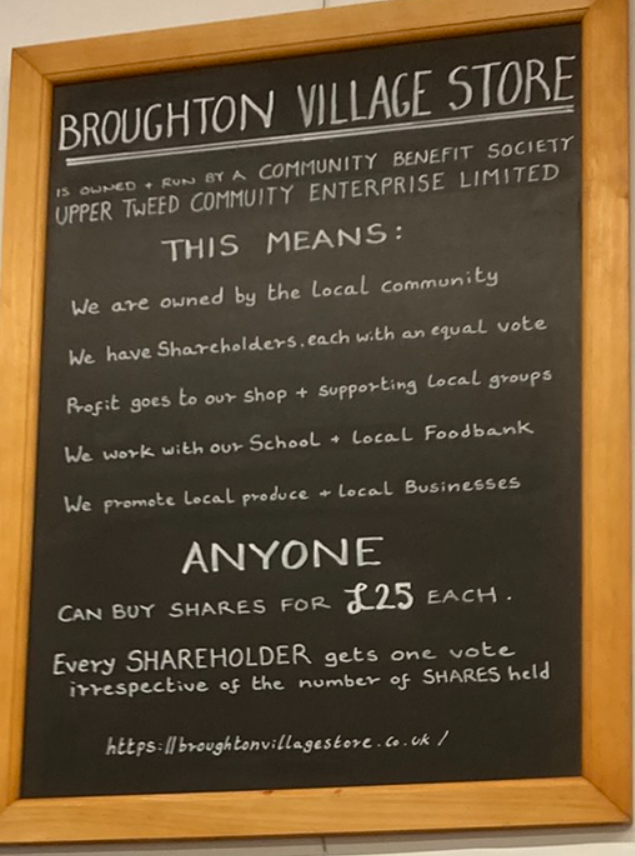 Broughton Village Store is owned and managed by UPPER TWEED COMMUNITY ENTERPRISE LTD, a Community Benefit Society registered with the Financial Conduct Authority No. 7979. Information on the structure of UTCE is available here.